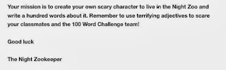 This week we have entered the "One hundred word challenge" for the first time. If you click on the link to the right you can read this weeks entries. The theme was a spooky, Halloween-type description of a scary creature.